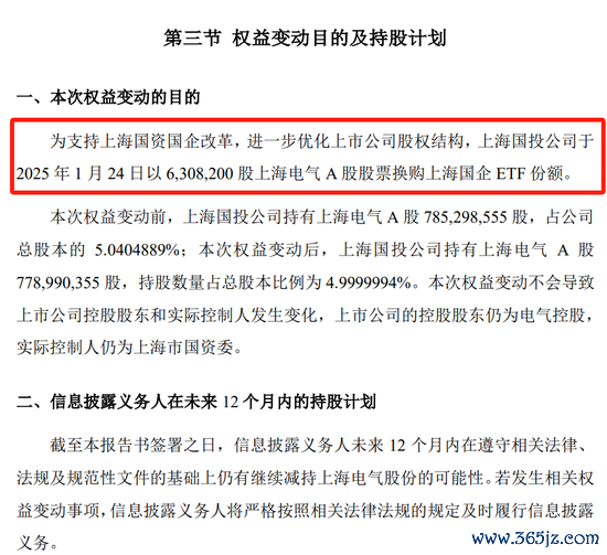 2025年1月24日,上海国投公司以自己持有的上海电气A股股票630.82万股换购中证上海国企交易型开放式指数证券投资基金份额,占上海电气总股本的比例为 0.0404896%,换购完成后,上海国投公司持有上海电气的股份比例从原来的5.04%,降低到4.99%。